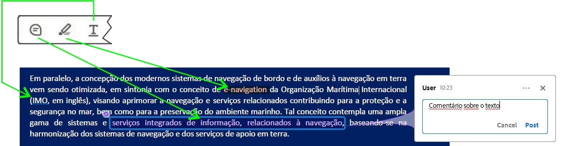 Selecionar o texto desejado, clicar com o botão direito do mouse e selecionar uma das três opções (ícones) do menú gráfico.